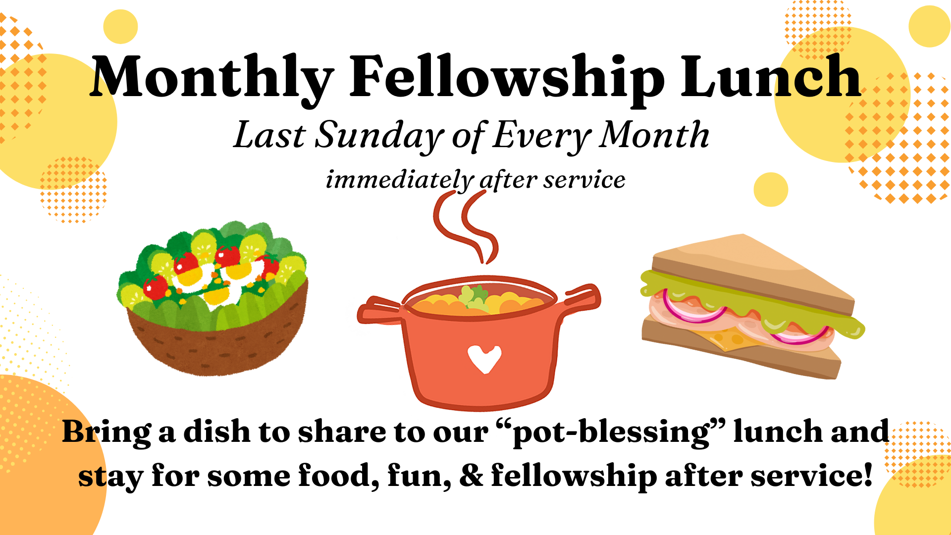 This is a “pot-blessing” style lunch so we ask everyone to bring a dish to share and enjoy a time of food and fellowship with your church family.