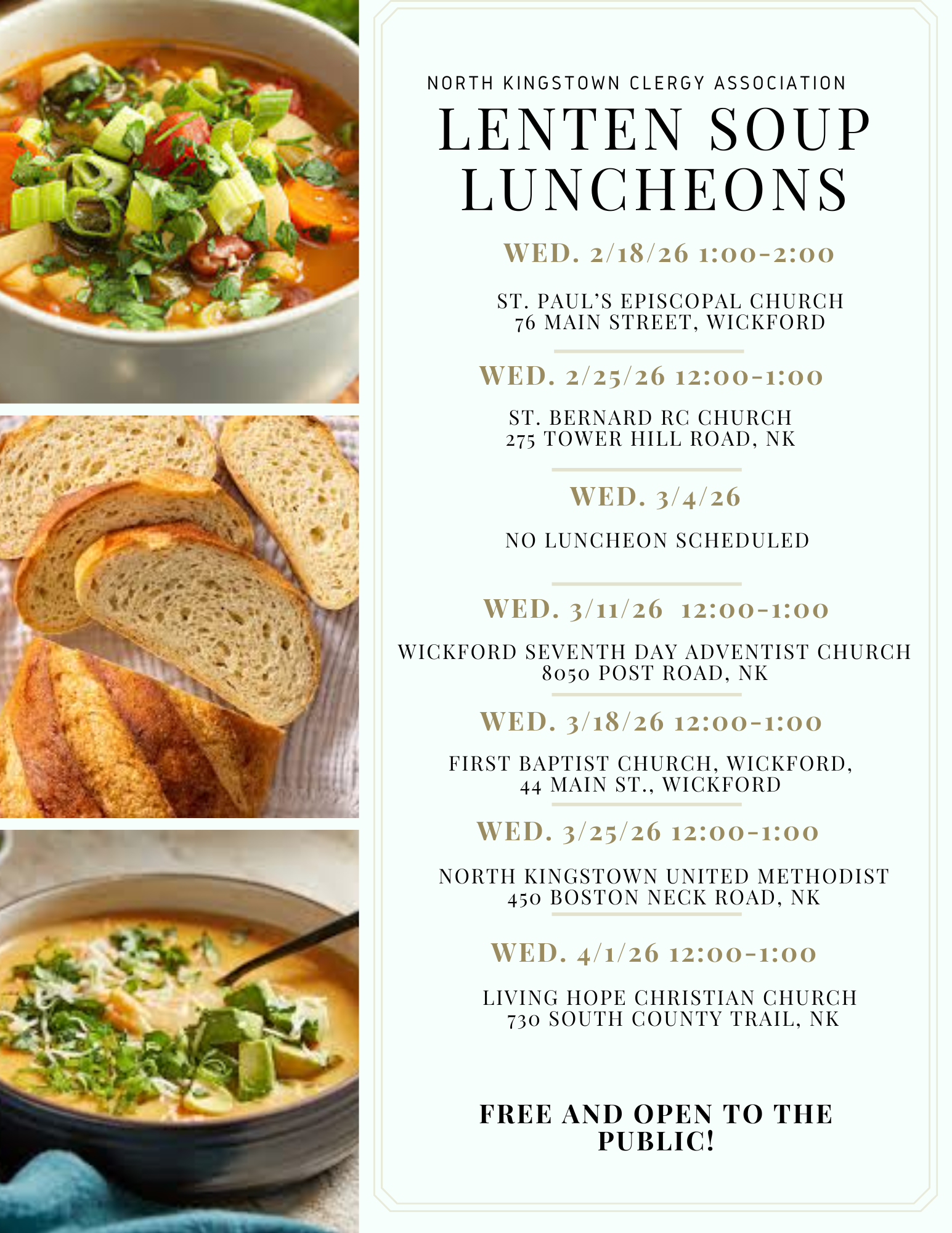 We are happy to be a host site for the North Kingstown Clergy Association's Annual Lenten Soup Lunches on Wednesday, April 1st. These lunches happen at different churches in North Kingstown every Wednesday from 12-1pm throughout the Lenten Season. They are all FREE and open to the public. If you would be able to make…