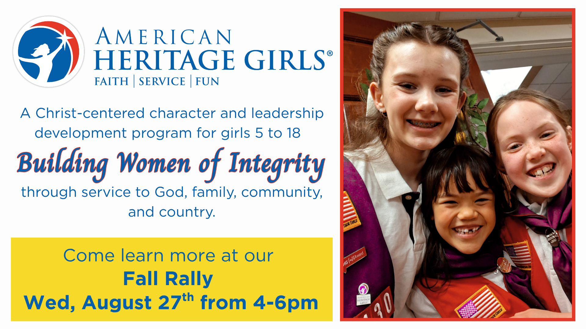 Are you looking for a Christ-centered character and leadership development program for your Daughter ages 5 through 18? American Heritage Girls is a Christ-centered character and leadership development program for girls 5 to 18 years of age. AHG is dedicated to the mission of building women of integrity through service to God, family, community, and…