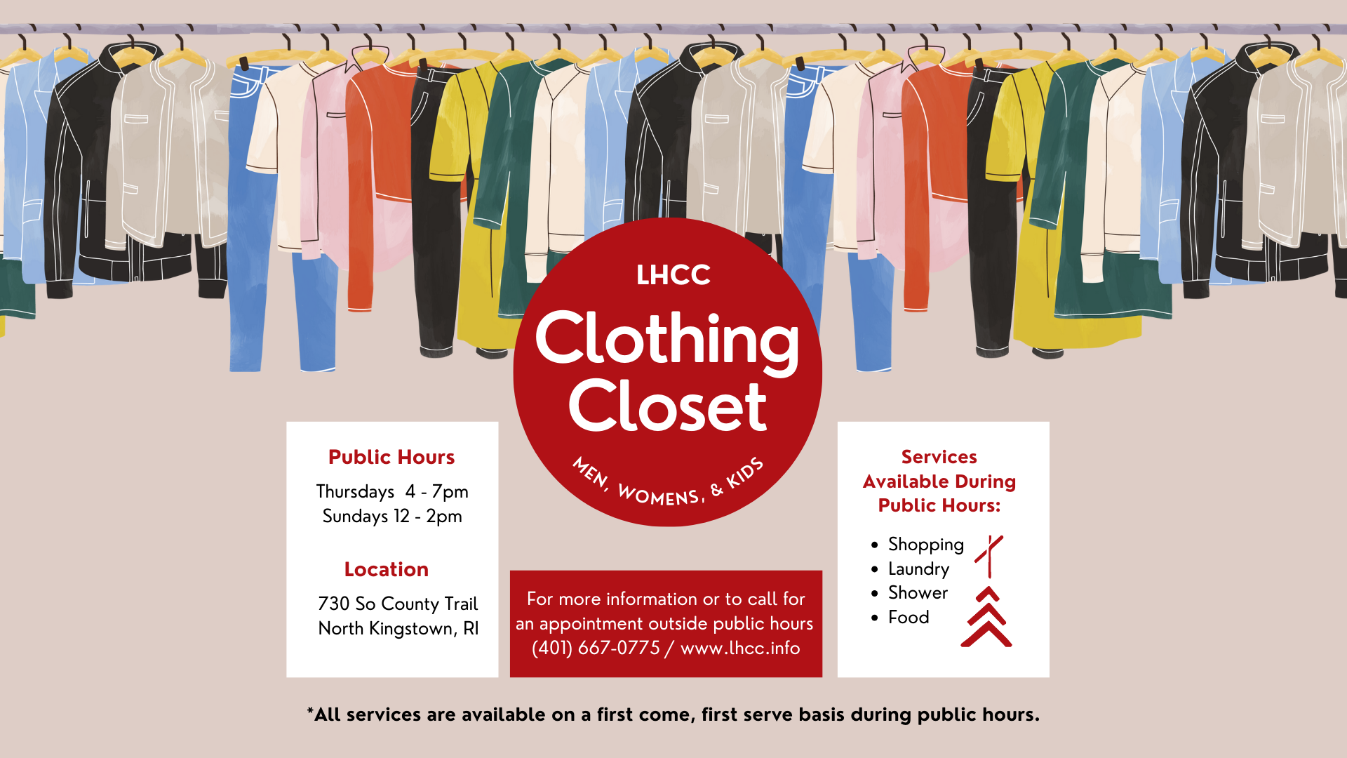 Shop for free clothing for men, women, and children during our public hours: Thursdays 4-7pm Sundays 12-2pm Other services available on a first come, first serve basis during public hours: Laundry Machine Shower Food Assistance If you need to make an appointment outside of our public hours for any of these services, please call the…
